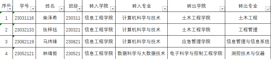根据《永利官网本科生学籍管理规定(修订版)》(防科发教[2017]78号)、《永利官网本科生转专业管理办法》(防科教[2019]32号)、《信息工程学院转专业管理暂行办法》等相关规定,经员工本人申请、转出学院和转入学院审核、信息工程公司党政联席会决定,拟同意柴泽希等4名同学转入2023级相关专业。