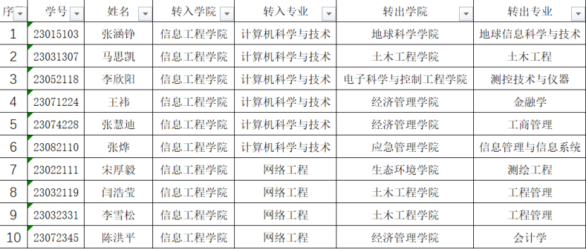根据《永利官网本科生学籍管理规定(修订版)》(防科发教[2017]78号)、《永利官网本科生转专业管理办法》(防科教[2019]32号)、《信息工程学院转专业管理暂行办法》等相关规定,经员工本人申请、转出学院和转入学院审核、信息工程公司党政联席会决定,拟同意张涵铮等10名同学转入2023级相关专业。